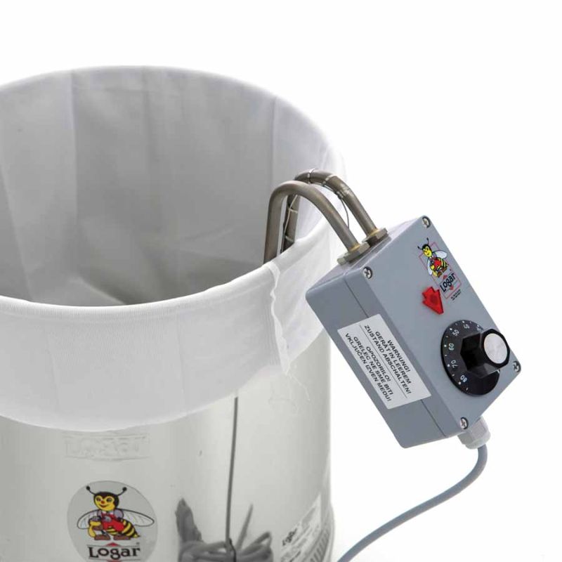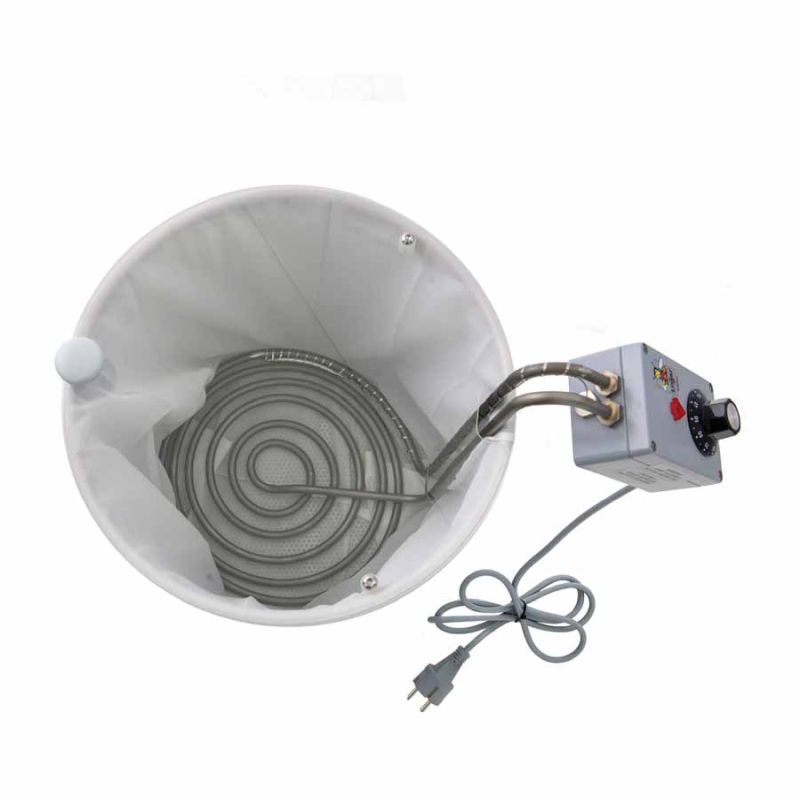 Stellen Sie einen geeigneten Unterstellbehälter (Innen-Ø 30,6–30,8 cm) unter den Honeytherm. Wir empfehlen die Verwendung von Logar Abfüllbehältern mit einem Innendurchmesser von 30,7 cm (35, 50 kg). Legen Sie den Seihsack in das Klärgefäß, spannen Sie ihn über den Rand und stellen Sie die Heizspirale hinein. Geben Sie den Honig dazu, so dass die untere Heizspirale vollständig bedeckt ist. Erst dann die Temperatur am Thermostat auf ca. 65 °C einstellen.