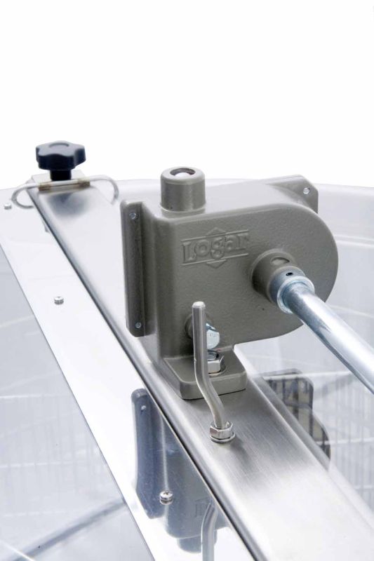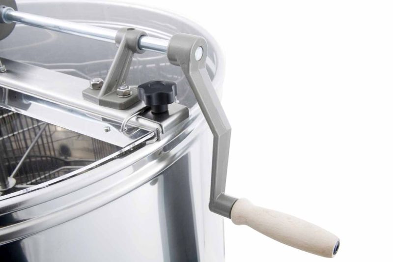 12/8-Waben Radialhonigschleuder, Handantrieb im Metallgehäuse mit Freilauf und Rückdruckbremse. Modernste Technik ermöglicht uns eine innovative Ausarbeitung des Honigschleuderbodens. Der Boden des Kessels ist nahtlos geschweißt und Richtung Auslauf geneigt. Der rostfreie Quetschhahn ist am tiefst möglichen Punkt angeschweißt, damit der gesamte Honig aus der Honigschleuder abfließen kann. Alle Teile der Honigschleuder, die mit dem Honig in Berührung kommen, bestehen aus lebensmittelzugelassenen Materialien. Der Deckel ist aus durchsichtigem Acrylglas. Eine besondere Konstruktion der Standfüße gewährt der Honigschleuder eine stabile Standsicherheit.