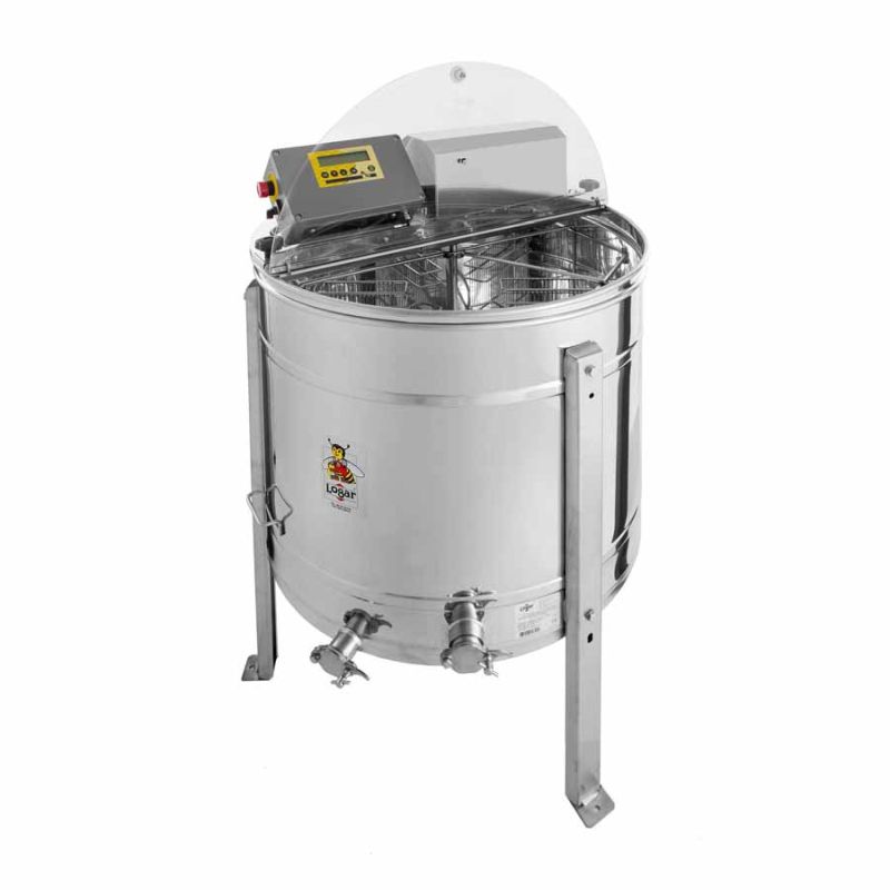6-Waben Selbstwendehonigschleuder mit Motorantrieb 180W / 230V und vollautomatischer Steuerung. Sie hat einen integrierten Sicherheitsschalter, welcher den Motor bei Deckelöffnung automatisch abschaltet. Modernste Technik ermöglicht uns eine innovative Ausarbeitung des Honigschleuderbodens. Der Boden des Kessels ist nahtlos geschweißt und Richtung Auslauf geneigt. Die Schleuder hat zwei rostfreie Quetschhähne 6/4'', einer ist am tiefst möglichen Punkt eingebaut, damit der gesamte Honig aus der Honigschleuder abfließen kann. Alle Teile der Honigschleuder, die mit dem Honig in Berührung kommen, bestehen aus lebensmittelzugelassenen Materialien. Der Deckel ist aus durchsichtigem Acrylglas.