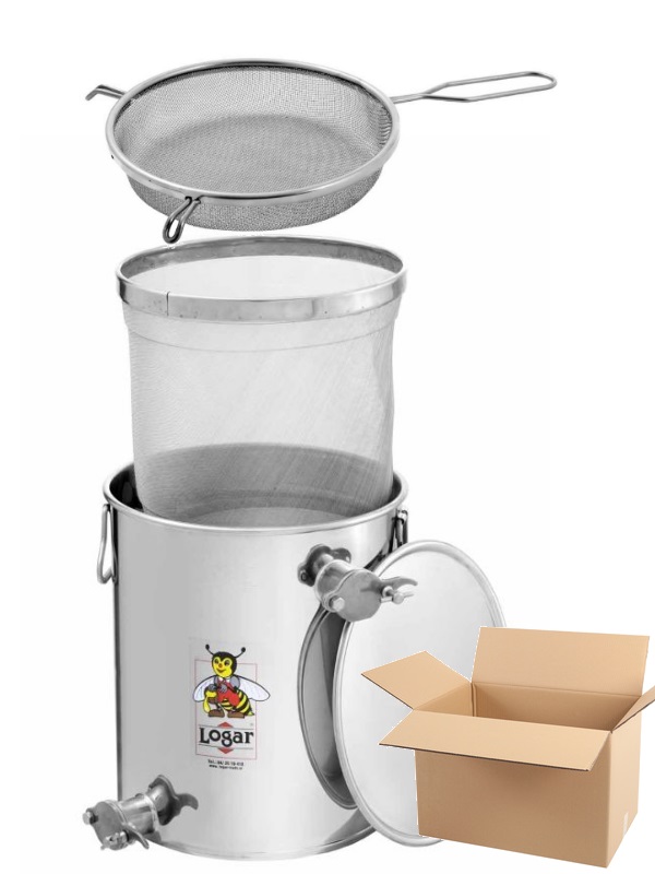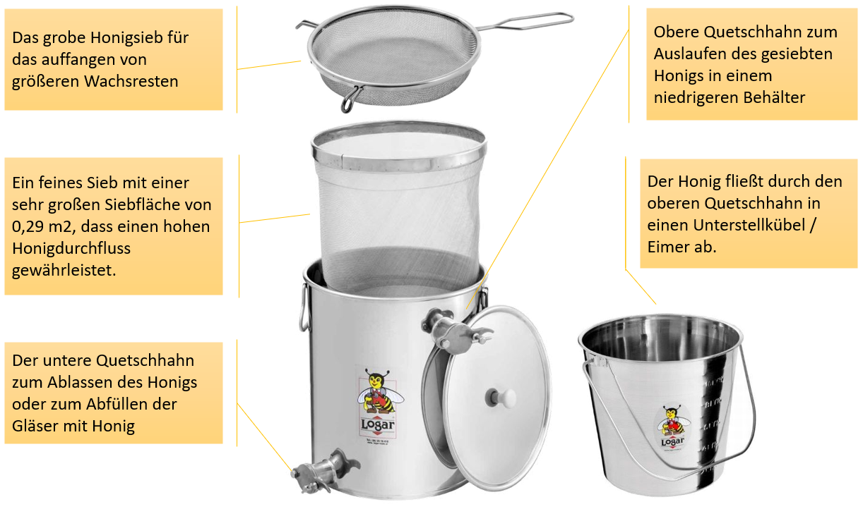 Ausstattung: 2 angeschweißte Quetschhähne (oberer XL-Quetschhahn für erhöhten Honigfluss), feines Innensieb aus Edelstahl-Gitterstoff